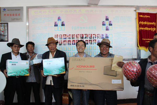 活动现场,省广电局向卡苏乎村党支部3个自然村的党员活动室赠送了3台液晶电视机、DVD机,3套村村通设备以及影视光盘和篮球、排球、羽毛球等体育用品,向卡苏乎村10名老党员、老支书每人送上了400元的慰问金,向卡苏乎村党支部赠送了18000元的支部活动经费,总价值达4万元。